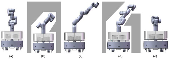 A sampling-based method is used to generate the collision-free configuration (Lines 10–19). Each angle is sampled in the selected range near the corresponding angle of the template configuration. The rule of range selection is to make it possible to sample more types of configurations suitable for similar environmental situations. In general, the ranges of the first four angles are relatively more important and should be selected very carefully. As shown in Figure 6a,c,e are template configurations, and b and d are generated configurations with sampling around template Figure 6c. A suitable sampling range of joints could generate a good configuration for variants of the template scene. Meanwhile, selecting a suitable sampling range does not destroy the diversity of configuration, as seen in Figure 6, with the value of the first four joints changing gradually, the template configuration in Figure 6c could change to the template configuration in Figure 6a,e. Thus, if the sampling range is well selected, almost all configurations for passing different shapes of scenes could possibly be generated with one of the templates. This method could improve the success rate of sampling and save sampling time. Then, routine MANIPCOLLISIONFREE() checks whether the sampled configuration is collision free. If it is collision-free, routine GENERATEMANIPPATH() would generate a reconfiguration path and the routine PLANMANIPPATH() would return . If a collision is found, another sample is taken, the collision checking is performed, and the process is repeated until a collision-free configuration is found, or the plan time is used up. Our sampling-based heuristic method avoids strange configurations caused by the randomness of the sampling-based method and has better performance with a smaller range of sampling.