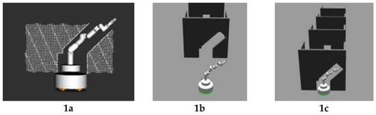 Simulation experiment for sampling-based heuristic method. (1a,2a,3a,4a) show the point clouds used in collision checking for scenario 1–4; (1b,2b,3b,4b) show the simulation environments of scenario 1–4; (1c,2c,3c,4c) show the suitable configurations for the manipulator which would not collide with the environment for scenario 1–4.