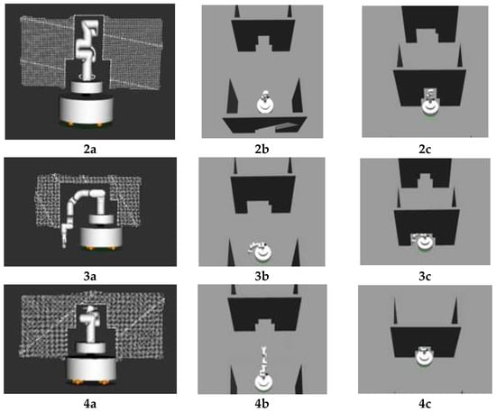 Then, in the same simulation environment shown in Figure 7, we conducted a preliminary experiment to validate the performance of our method in traversing the door-type scenes. Here, the path of the mobile base was given as a straight line while the reconfiguration of the manipulator was tested. As shown in Figure 7, four different obstacles were designed so that the mobile manipulator could pass through them only with a specific collision-free configuration. The mobile manipulator had to pass four obstacles in a row to complete the experiment. As shown in Figure 7 column c, when the mobile manipulator detected an obstacle, it would find the most similar template very quickly and find a suitable configuration for the manipulator which would not collide with the narrow channel. The results are shown in Table 2. The experiment was repeated 10 times and in all experiments the robot was able to change its configuration for each obstacle and reach the goal. The average time of planning for one obstacle is 1.2 s and the average execution time of each experiment is 20.5 s. In this experiment, the linear speed limit of our mobile manipulator was set to 0.5 m/s. Compared to the execution time, the time for path planning is much shorter.