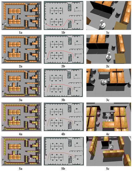 Simulation Experiment. (1a,2a,3a,4a,5a) show the configurations for the mobile manipulator in the experiment; (1b,2b,3b,4b,5b) show the global map for the mobile base in the experiment and the red line in each map is the global path; (1c,2c,3c,4c,5c) show snapshots for the mobile manipulator in the experiment. Please see the text for a description.