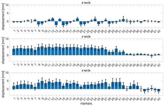 Figure 2 reports the bar plots regarding the mean displacements along the x-, y-, and z-axes with the corresponding uncertainty of the 42 markers considering all the subjects. Results show that the axis where the displacements are widespread is the y-axis, whereas the magnitude displacements are less than 10 mm.