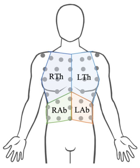 To identify the markers that showed the most significant displacement during respiratory activity considering the whole volunteer population, we used Principal Component Analysis (PCA), one of the most used methods for dimensionality reduction. It allows for the representation of the observed signals as a set of new orthogonal variables defined as Principal Components (PCs) [34]. Given the results depicted in Figure 2, we considered only the displacements along the y-axis of the 42 markers partitioned into the four compartments of the chest wall (right thorax—RTh, right abdomen—Rab, left thorax—LTh, and left abdomen—Lab), as shown in Figure 3.