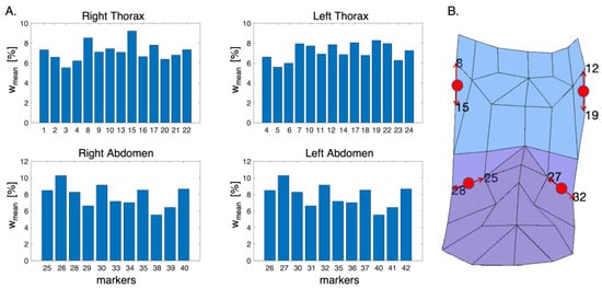 (A) Bar plots of the mean percentage weight expressed by each marker for each compartment. (B) Schematic representation of the anterior chest wall with highlighted the positions of the non-reflective markers (in red). The red arrows identify the photo-reflective markers used as reference to place the non-reflective ones.