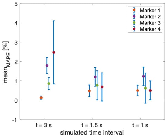 Mean value of the MAPE in percentage for each non-reflective marker during the three simulated time intervals (i.e., t = 3 s, t = 1.5 s, and t = 1 s).