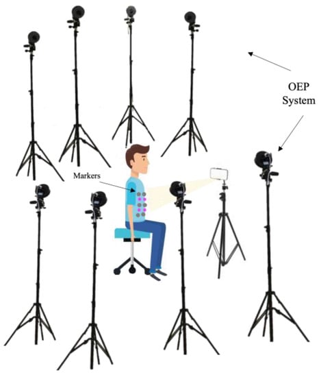 Each volunteer was asked to sit on a chair without a backrest facing the digital camera, remaining as motionless as possible. The tests were performed in the laboratory with an eight-camera OEP system used as a reference (as the previous described). The proposed system includes a digital RGB camera and four non-reflective markers with different diameters (i.e., 24 mm, 22 mm, 20 mm, and 18 mm) attached on the subject’s torso at the level of the photo-reflective markers, which express the best displacements (see Section 2.1.3). The camera was placed on a tripod about 1 m from the subject. Before starting the tests, the digital camera was calibrated according to the process described in Section 2.1. The experimental setup is reported in Figure 7.