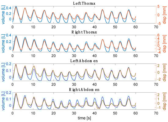 To reconstruct the markers’ displacement, each respiratory act was identified based on the volume by selecting the minimum point corresponding to the end of inspiration and the maximum point of the start of inspiration. Each respiratory act along the coordinates x, y, and z was obtained according to Equation (2):