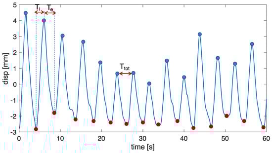 - Inspiratory, expiratory, and total time estimation: for each performed trial, Ti was computed as the time difference between the time at which the maximum peak occurs and the time at which the minimum peak for the i-th breath occurs; Te was the time difference between the minimum peak and the time at which the maximum peak for the i-th breath occurs; Ttot is the time difference between two consecutive maximum peaks (see Figure 9).