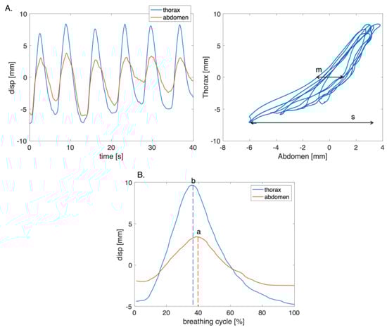 (A) Plot of the thoracic and abdominal compartments signals with the corresponding figure of Lissajous of the six respiratory acts, where m is the volume displaced by the abdomen at 50% of the thorax volume, while s represents the total volume displaced by the abdomen. (B) Example of a single respiratory act used to compute PS, where a and b are the time points at which the change in the direction of the thorax and the abdomen signals occur.