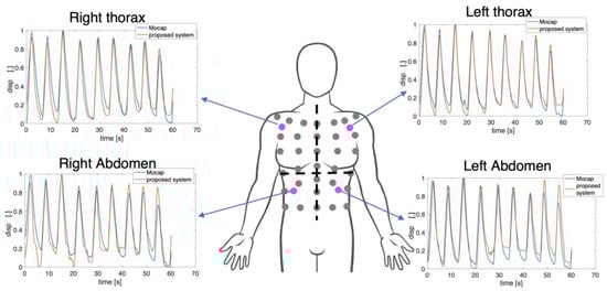 Figure 11 reports the obtained displacements per compartment (i.e., RTh, RAb, LTh, and LAb) from four non-reflective markers attached to the torso of the subject against those estimated from the reference system. In detail, the displacements expressed by markers closest to the non-reflective ones were used. There is a good agreement between the signals extracted from the video and the reference one in terms of amplitude and trend both for the thoracic and the abdominal displacements.