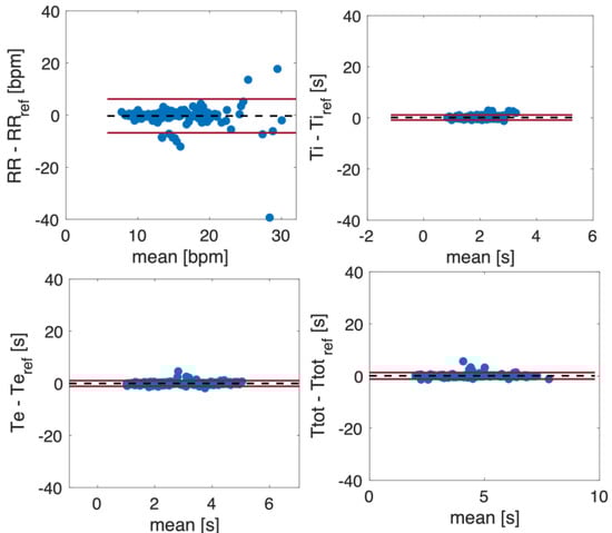 Figure 12 shows the Bland–Altman plots for the fR, Ti, Te, and Ttot values estimated from the respiratory signals retrieved from the video. The dashed line represents the Mean of Difference (MOD), and the red lines are the upper and lower Limit of Agreement (LOA). The Bland–Altman plots include all the subjects’ values, considering quiet and deep breathing. Both fR and Ttot estimated from the video signals show a good agreement with the reference ones, with a MOD ± LOAs of −0.3 ± 6.5 bpm and MOD ± LOAs = 0.08 ± 1.25 s, respectively. Considering Ti and Te, LOAs below 1 s were achieved.