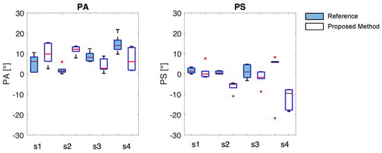 The TAA indexes are reported with PA and PS values with boxplot where the median and the IQR (Figure 13) are shown to visually compare instruments in the estimation of the asynchrony between the thorax and the abdomen in healthy volunteers during deep respiration. The blue filled boxplot represents the results obtained with the reference system.