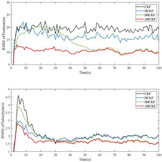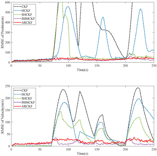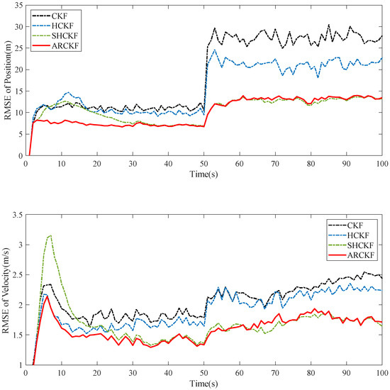 In order to verify the robustness and accuracy of the ARCKF algorithm proposed in this paper, three possible situations in maneuvering target tracking are simulated and compared with the estimation results of the CKF [14], HCKF [27], and Sage–Husa cubature Kalman filter (SHCKF) [29]. It should be noted that in order to maintain robustness, the conventional SHCKF method cannot concurrently perceive process noise and measurement noise. Therefore, we consider improving the SHCKF with the method in Reference [8]. Although this approach trades some noise perception accuracy, it can guarantee that the algorithm will maintain robustness and perform comparative experiments more effectively. In the experiment, 100 Monte Carlo simulations were run to reflect the tracking capability of these algorithms as accurately as possible.
