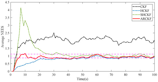 Figure 4 shows the RMSE of the position and velocity estimation of different filtering algorithms in Case 5.2. In this case, the HCKF has better filtering accuracy than CKF, converging more quickly during the early filtering stage than CKF; the filtering accuracy of the SHCKF and ARCKF is significantly higher than that of the above two algorithms, but the convergence speed of the SHCKF in the initial stage of filtering is the slowest among the algorithms, which is most obvious in the RMSE of position estimation. The ARCKF retains the advantage that HCKF has the fastest convergence speed in the initial filtering stage. The ARCKF can update the measurement noise covariance in real time, which improves the filtering accuracy of HCKF, and the tracking effect is better than the other three filtering algorithms. Figure 5 shows the estimation consistency of the various filtering methods in Case 5.2. Only the consistency of the CKF is severely impacted by non-Gaussian noise. The other algorithms offer good consistency, but only the ARCKF can do so at the initial filtering stage.