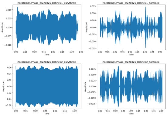 Multiple recordings were taken from different plants, including lettuce plants and beans, to create a more diverse dataset consisting of different plant species. During the experiment, six recordings were taken from the same plant on a weekly basis. At the same time, “control readings” were performed simultaneously by collecting spikerbox recordings of plants without any exposure to eurythmy. On the other hand, recordings tagged as “eurythmy” were taken while an actor was performing eurythmic gestures next to the plant. In this way, we were able to capture the voltage differentials of “experimental” and “control” plants, allowing us to analyze a dataset with two populations of vegetables, trying to find distinctive differences in patterns and build classification machine learning models to distinguish between beans and lettuce plants exposed to eurythmy or not.