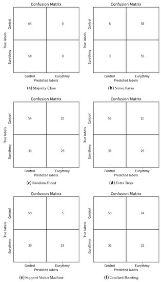 Using the same training and test split for every experiment, we created popular classical machine learning classifiers. The specific parameters used in their creation can be found in Section 4. For each trained classifier, we used the model to predict the values of the test dataset, obtaining their f1-score, accuracy, precision, and recall values, which can be found in Table 3. The confusion matrices for all classification models can be found in Figure 5. It is important to note that apart from Naive Bayes, Random Forest, Extra Trees, Support Vector Machine, and Gradient Boosting classifiers, we have included the results for the majority class as a baseline, which involves classifying all of the data as the majority class, in this case the control. This can aid by putting the results into perspective. To aid in analysis of this table, the best results for each metric have been highlighted. When looking at the model with highest recall and f1-score, which is Naive Bayes, we could initially think that the model has performed well, but taking a closer look at the metrics, we can see that it has an even lower accuracy than the baseline, predicting correctly only half of the time. Its confusion matrix shown in Figure 5b reveals that the recall is so high because most of the values have been classified as Eurythmic, causing most of the true eurythmic values to be classified correctly. However, the high number of false positives makes this a low-quality model. Regarding the model with the best accuracy, which is Random Forest, we see some promising results. In Figure 5c, we can see that even though the number of false negatives is slightly higher than true positives, which impacts the recall negatively, the precision is higher than average, which means that when our model makes a eurythmic prediction, it has a higher chance of being right. However, the model with the best precision in our experiments is SVM, which when paired with the highest true negative rate of the explored model, makes it an interesting option. In conclusion, all models except for Naive Bayes show similar accuracy and precision values and some promise in the accurate detection of eurythmic movements for our specific tests, though the f1-score and recall values show some room for improvement.