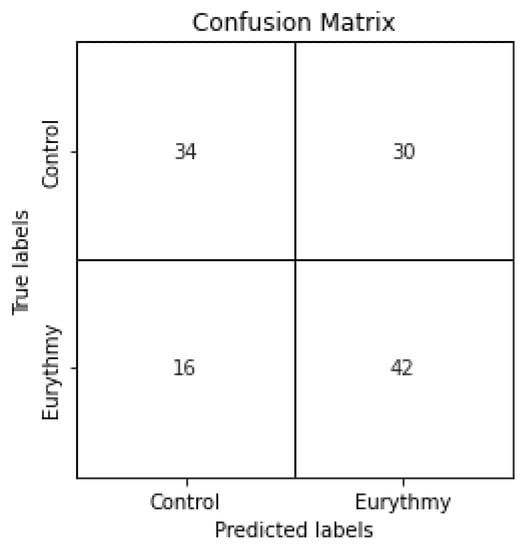 Several experiments were performed, creating a range of options by varying the number of epochs and the validation split. The best results for the classification problem were found by restoring the best weights regarding the minimum validation loss with 100 epochs and a validation split of 0.2. We achieved an accuracy of 62% and an f1-score of 65%, as well as a precision of 58% and a recall of 72% in the classification task. Even though the results in Figure 6 show a relatively large number of false positives (control files classified as eurythmy), the low number of false negatives shows that when our model classifies a file as control, it has a higher chance of being correct, resulting in a recall of 72%. The highest values in the confusion matrix are also correctly identified control values and correctly identified eurythmic values. Therefore, the model shows some promise in distinguishing between plants in their normal state and plants which are experiencing eurythmic gestures being performed next to them.