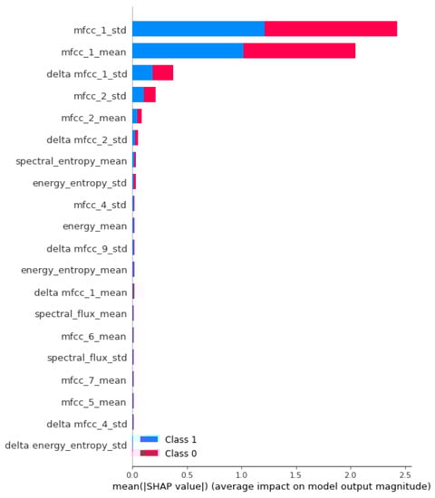 Figure 7 depicts the computed SHAP (Shapley additive explanations) values for the generated deep learning model. These SHAP values provide insights into the individual feature contributions to the model’s output [23]. The analysis reveals that three specific features, namely mfcc_1_std, mfcc_1_mean, and delta mfcc_1_std, exhibit a consistently high average impact on the model’s predictions.