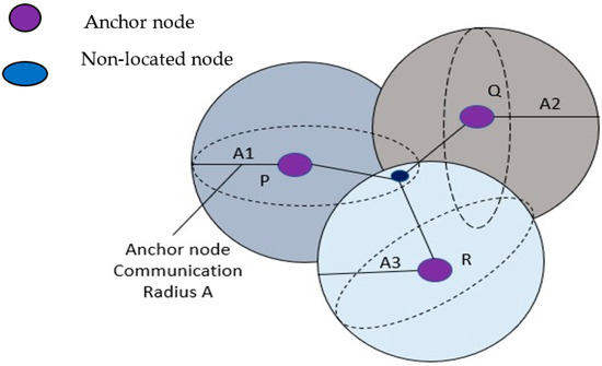 Based on this formula, we can calculate the distance between the unknown nodes (A1, A2, and A3) and the anchor nodes (Ap, Aq, and Ar). Let us denote these distances as dPA, dQA, and dRA, respectively. Now, we have the following Equations (2)–(4) for the distance between unanchored nodes and anchor nodes: