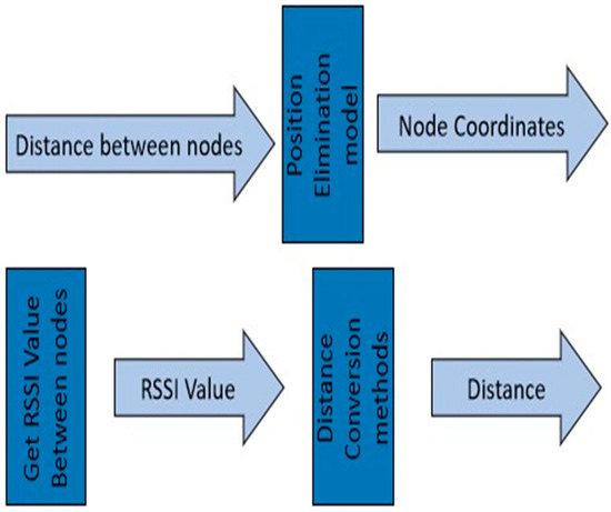 The proposed algorithm for calculating the intensity of an incoming received-signal-strength-based ranging method aims to interpret the signal intensity from an anchor node at a specific distance using an unnamed node. In this scenario, the anchor node is movable and responsible for transmitting the signal. However, due to environmental factors, there is some data loss during the transmission process. As the distance increases, the unlocated node experiences higher signal attenuation, leading to a lower received RSSI. To calculate the transmission loss, the route loss model is employed, which is reflected in the received signal strength. In real-world operations, the loss model is implemented using a log-normal distribution model. This algorithm enables the estimation of signal intensity and helps determine the distance between the unnamed node and the anchor node, based on the received RSSI values; this is depicted in Figure 4.