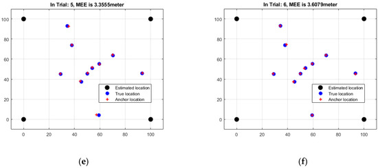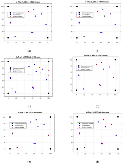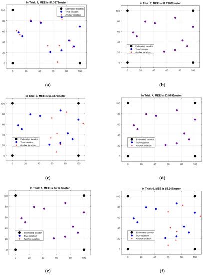 Data analysis of RSSI-based MEEs of six iterations: (a) Trial 1 (b) Trial 2 (c) Trial 3 (d) Trial 4 (e) Trial 5 (f) Trial 6.