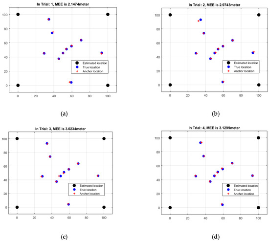 The distance between sensor and anchor nodes must be measured for network localization. As a result of using this strategy, the network takes on a square shape, with nodes separated by 100 m along the perimeter. Because there are no fixed sensor nodes present, mobile sensor nodes are free to traverse the allotted space at their leisure. The network has fourteen nodes, four of which are fixed and ten of which are mobile. Each sensor node in the network has the ability to communicate with one of the anchor nodes. These anchor nodes are deliberately located at each of the network’s four corners. These devices are 90% accurate in terms of distance estimation, with an error ratio of 0.1 m. This concept is best illustrated by an accuracy of one metre or near it. Before proceeding with real distance measurements between sensor nodes, it is important to make a calculation to prove that the sensor nodes are not evenly distributed. After installing the sensor nodes, the procedure of collecting MEEs and assessing the findings is repeated several times. This procedure has been extensively tried and tested; data from six separate experiments on angle, distance, and RSSI are considered. The MEEs oscillate between 51.3579 m and 55.2470 m, with respect to angular measurements, MEEs’ distance-based measurements ranged from 2.1474 to 3.6079 m, and MEEs range from 0.12213 to 0.4860 m for RSSI-based measurements, as depicted in Table 4.