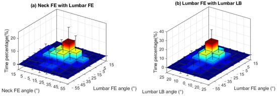 The 2D histogram plots (Figure 5) illustrate the distribution of combined joint motions across joints and degrees of freedom. Combined lumbar and neck flexion angles varied largely between participants with the highest distributions in 10 to 30 degrees lumbar flexion and 10 to 40 degrees neck flexion. The lumbar flexion with rotation had a more concentrated range than neck combination postures. More combined movements are seen in the neck joint (Figure 5e) than in the lumbar joint (Figure 5c).