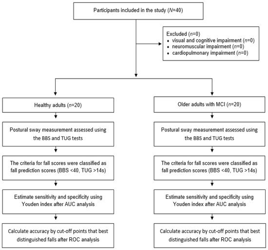A convenience sample of 20 healthy adults (mean age, 25.20 ± 3.19 years) and 20 older adults with MCI (mean age, 79.00 ± 8.25 years) were recruited from a major university and senior citizen community center, respectively. Postural sway measurements were conducted in an ecological community rehabilitation center to determine the sensitivity, specificity, and accuracy of the PSD system in healthy adults and older adults with MCI at a high risk of falls. All subjects provided their informed consent for inclusion before they participated in the study. The study was conducted in accordance with the Declaration of Helsinki, and the protocol was approved by the Ethics Committee under no. 1041849-202202-BM-033-02. None of the participants had any known medical issues. The inclusion criteria for older adults with MCI were: (1) an activities-specific balance confidence scale (ABC) score below 1000, (2) age over 65 years, (3) a mini-mental state examination (MMSE) score of 20–23, and (4) a history of falls (e.g., at least one fall in the past 3 months). The exclusion criteria were the presence of visual or cognitive impairment or any neuromuscular or cardiopulmonary impairment influencing the experimental tests [23]. The flow chart is presented in Figure 1.