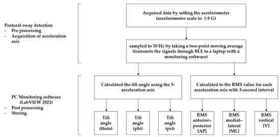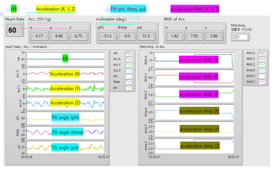 We obtained data by setting the accelerometer scale to ±8 G and monitored the accelerometer signal data using LabVIEW 2021 software at a sampling frequency of 50 Hz. (Figure 4 and Figure 5) The tilt angles (theta, phi, and psi) were calculated by computing the gradient using the three acceleration axes. The magnitude of the acceleration amplitude (AMP) was updated by subtracting the minimum value of the data collected every second from the maximum value. The root mean square (RMS) of the acceleration AMP was updated by collecting data in groups of three. The RMS of the acceleration AMP and tilt AMP data were updated every 3 s and were presented qualitatively in LabVIEW 2021. The AP-, ML-, and V-direction RMS values were used to determine the RMS value for each acceleration axis. The tilt angles (phi, theta, and psi), RMS, and AMP data were stored locally. The tilt angle was calculated every 25 Hz using the arctan formula for the three-axis components of gravitational acceleration (1 G).