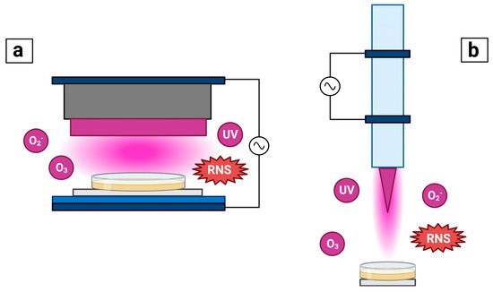 Most common non−thermal plasma configurations: (a) dielectric barrier discharge (DBD) plasma and (b) plasma jet.