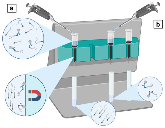Magnetic-activated cell sorting (MACS) overview. (a) The separation columns are surrounded by a magnetic field and loaded with semen mixed with annexin V labeled microbeads. The magnetic field will retain apoptotic spermatozoa tagged to the microbeads while non-apoptotic spermatozoa will flow through the column. (b) Once non-apoptotic spermatozoa are collected, the column is flushed, and apoptotic spermatozoa are washed out.