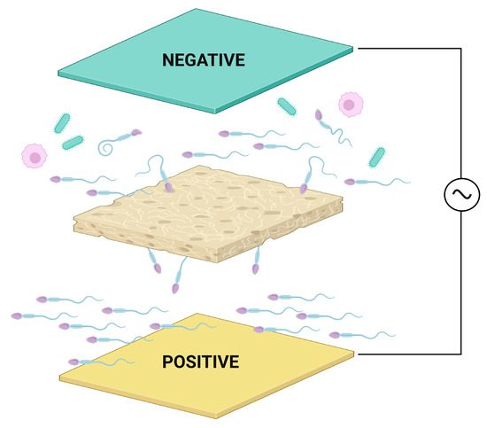 Finally, microelectrophoretic techniques retrieve spermatozoa from semen based on their charge and size [160,176,177]. The charge of mature spermatozoa is inherently negative [160,178], which develops with sialic acid formation on the sperm surface late in the maturation process. As such, within an electric field, more mature and negatively charged spermatozoa will be drawn towards the positively charged anode [177]. This process will enable the separation of mature and viable spermatozoa from their damaged or immature counterparts. At the same time, spermatozoa will be separated from other seminal components based on their size [160,177]. During microelectrophoresis, a polycarbonate membrane separates the electrophoretic chamber with pores large enough to enable vital spermatozoa to pass through while other larger undesirable cells in the semen will be retained on the membrane (Figure 3). A microelectrophoretic device called Felix™ that separates high quality sperm from raw semen, by a process combining electrophoresis and size exclusion membranes, is already commercially available. The device consists of a system of chambers connected with platinum-coated titanium electrodes. The sample and harvest chamber are separated by a 5 μm thick polycarbonate membrane which filters out vital and healthy spermatozoa from other contaminating cells such as germ cells, leukocytes, and, eventually, bacteria. One separation cycle lasts 6 min with a constant current of 75 mAmps and a variable voltage of 18–21 mV [160]. The device has been already tested out against conventional density gradient centrifugation across five international ART centers with both methods being capable of isolating highly vital and motile spermatozoa. Whilst the yield was lower with the Felix™ device, the recovered spermatozoa presented with a significantly improved DNA integrity relative to density gradient centrifugation. More importantly, the preparation time and workflow were significantly reduced with microelectrophoresis which may be a highly welcome asset in clinical andrology [179].
