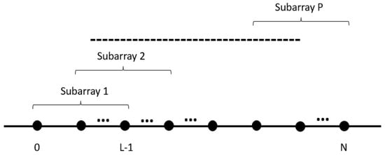 As the received signal is coherent, subspace-based and propagator-based algorithms cannot be used directly. And one of the most famous decorrelation algorithms is the spatial smoothing algorithm. The entire array is divided into subarrays, and represents the number of array elements in each subarray, the subarray is shown in Figure 2, where dotted line represents subarrays not shown in the figure. The relationships between , and can be expressed as follows: