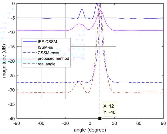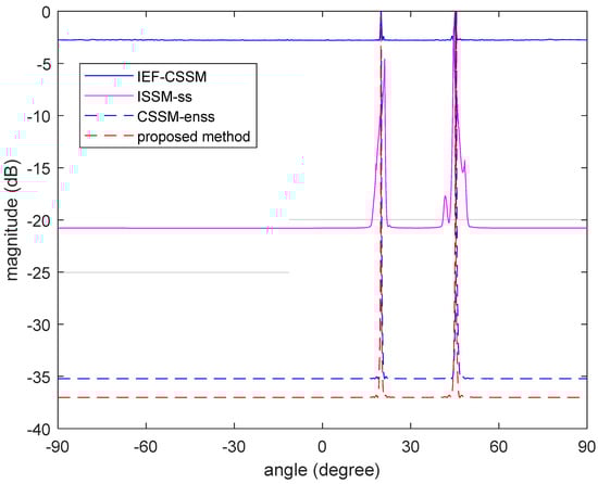 To prove the superiority of the proposed method, we compared it to several other methods. The four methods used are as follows: (i) Using the method in [15], which uses conventional ISSM algorithm, decorrelation was performed via the traditional spatial smoothing algorithm (named ISSM-ss); (ii) after constructing the focus matrix using the traditional CSSM algorithm, we used the enhanced spatial smoothing algorithm for decorrelation (named CSSM-enss); (iii) we then used the focusing algorithm that does not require the initial estimation to generate the focus matrix (named IEF-CSSM); and (iv) the algorithm proposed in this article was used.