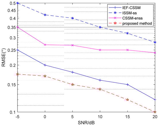 As shown in Figure 4, the RMSE of each method becomes smaller as the SNR gradually increases. Among the methods, the CSSM-enss method suffers from a definite impact on the final estimates because the method used to construct the focus matrix is the conventional CSSM algorithm that requires an initial estimation value, though CSSM-enss has a better performance than ISSM-ss in its decorrelation algorithm, meaning that the performance of the CSSM-enss method is slightly better than that of the ISSM-ss method. However, the IEF-CSSM method is slightly more accurate because it uses an algorithm that does not require initial estimation values, but the final performance is weaker than that of the proposed method because of the poor decorrelation method.