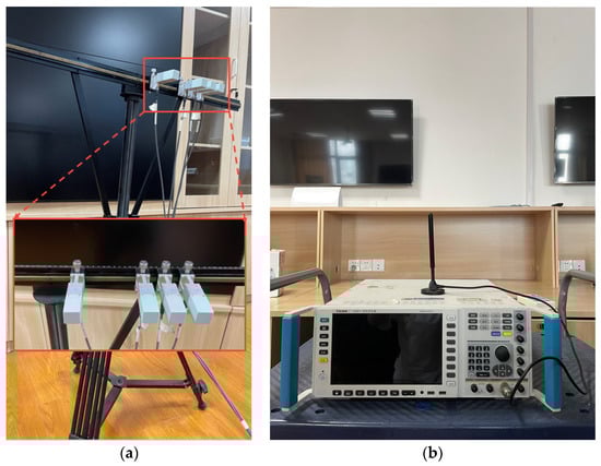 (a) is the sparse array used in the experiment, which used a tripod and a spirit level to ensure the stability of the support frame used for observation. (b) is the signal generator used in the experiment.