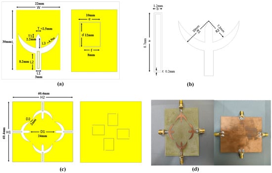 The geometrical representation of the proposed antenna: (a) front and back, (b) CSRR and arch, (c) MIMO antenna system, (d) prototype of antenna.
