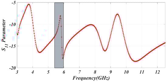 Furthermore, when a CSRR is placed at the ground plane, it enables the attainment of a WLAN notch band characteristic. This notching characteristic effectively eliminates crosstalk between the narrow WLAN band and the UWB bands, which experience a high volume of data transfer. The corresponding wavelength of the CSRR, as determined by Equation (1), is calculated to be = 17.6 mm for the 5.5 GHz WLAN band shown in Figure 3.