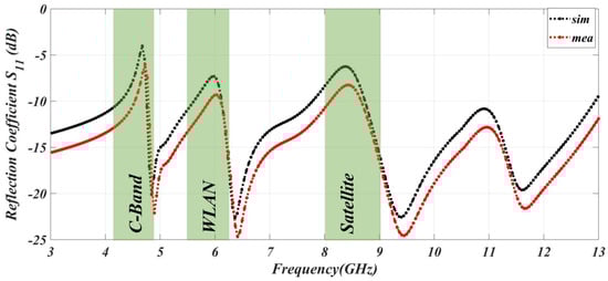 The simulated and measured result of the reflection coefficient at the C, WLAN, and satellite bands.