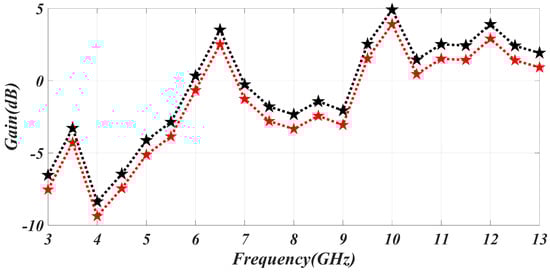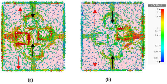 The resonant behavior of the system can be elucidated by examining the surface current distribution on the top and bottom metallic layers, as illustrated in Figure 8. According to Faraday’s law, a time-varying magnetic field confined between two metals induces surface currents on these layers in opposing directions. As depicted in Figure 8a,b, at the resonant frequencies of 5.5 GHz and 8.8 GHz, a remarkable observation emerges: the net currents on the top and bottom layers (referred to as the ground plane) flow in diametrically opposed directions. This distinctive characteristic of oppositely directed currents on the top and bottom layers results in the attainment of a pronounced magnetic resonance at 5.5 GHz and 8.8 GHz, as evidenced in the figures. The black arrow in the diagram signifies the distribution of current on the top patch, whereas the red arrow corresponds to the current distribution on the bottom metallic layer. Furthermore, the current distribution pattern discernible in the antenna’s resonant mode bears resemblance to that of a dipole. Such behavior grants the antenna the ability to maintain stable radiation patterns across a wide frequency band, which proves to be an advantageous trait in practical applications.