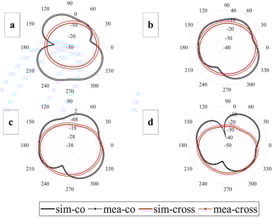 The simulated and measured results of radiation patterns at different frequencies: (a) C-band notch frequency 4.45 GHz, (b) WLAN notch frequency 5.5 GHz, (c) in-band frequency 6.25 GHz, (d) satellite notch 8.5 GHz.