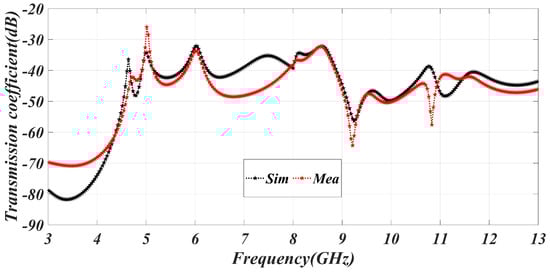 The provided monopole, crescent-shaped, 4 × 4 MIMO antenna exhibits a circular configuration in Figure 1, which is advantageous for achieving pattern and polarization diversity. Antennas 1 and 2 contribute to polarization diversity, while antennas 1 and 3 enable pattern diversity. To assess the effectiveness of the monopole UWB-MIMO antenna, various critical parameters are examined. Figure 9 presents the transmission coefficient of the UWB-MIMO antenna, indicating a −25 dB transmission coefficient among the ports, which does not degrade the characteristics of the MIMO system. The high isolation in the MIMO system is achieved through the mutual coupling of CSRR.