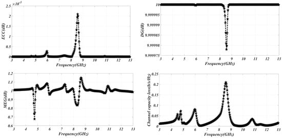 The inter-antenna correlation is evaluated using the envelope correlation coefficient (ECC) of the UWB MIMO antenna’s diversity parameter. In a MIMO system, low correlation between antennas is desirable, and therefore the ECC (envelope correlation coefficient) value should be close to or at its minimal value, which is zero. In the case of the MIMO antenna system under investigation, it is crucial for the ECC to remain below a certain threshold throughout the entire operating frequency range. Specifically, the ECC should be less than or equal to 0.5 to ensure satisfactory performance and can be calculated using Equation (2).