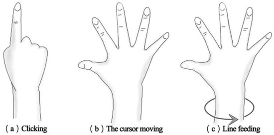 In order to enable gesture recognition, we developed a custom program using Leap Motion (140° × 120° field of view; 10–80 cm interaction depth), which we positioned on the VR headset. We defined three distinct gestures to control the cursor movement, including clicking letters, cursor movement, and line feeding, as illustrated in Figure 1.