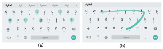 However, the efficiency of an input method could not be comprehensively assessed by merely measuring the speed or accuracy independently. Rather, it was necessary to consider the trade-off between these two factors. Previous studies permitted participants to correct input errors, so if all errors could be amended, the speed would indicate the effectiveness of the method. However, practical experiments showed that errors were still committed by participants, prompting the need to take the trade-off into account [31,32]. Fitts’ law defines the speed–accuracy trade-off as the quotient of the task’s degree of difficulty divided by the task’s mean time, which measures the number of bits of task difficulty that an interface can process per second [31,32]. Similarly, in this study, we examined the typing efficiency (TE) by calculating the product of the input speed (without error correction) and the input accuracy, thus indexing how many words the user could accurately enter with the specific input method per unit time. The TE formula was
