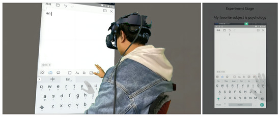 The participants were able to observe the real-time user interface (UI) of the virtual machine through a head-mounted display (HMD), with phrases being sequentially displayed on top of it. Whenever a phrase was completed by the participants, they would then press the trigger button on the controller to move on to the next phrase. The experimental setting adopted a gray background, intended to facilitate participants’ concentration. The participants’ hands were displayed via a model with 50% transparency, as depicted in Figure 3.