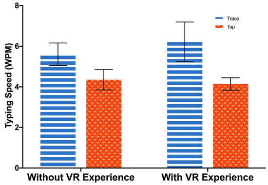 A meaningful interaction between variables indicated that the VR experience had a larger impact on the input speed of Trace compared to Tap. Figure 5 illustrates the disparity between the VR-experienced and -inexperienced participants in terms of their input speed. The VR-experienced participants were able to input text more swiftly when using Trace compared to VR novices, while no significant difference was observed when using Tap. This could be attributed to the proficiency that the experienced users possessed in mapping physical hand movements to their virtual reality counterparts, enabling them to manipulate virtual objects with greater ease and finesse. As Trace necessitated drawing a continuous trace to input words, it required more precise control than Tap, which may have also contributed to the observed differences in input speed.