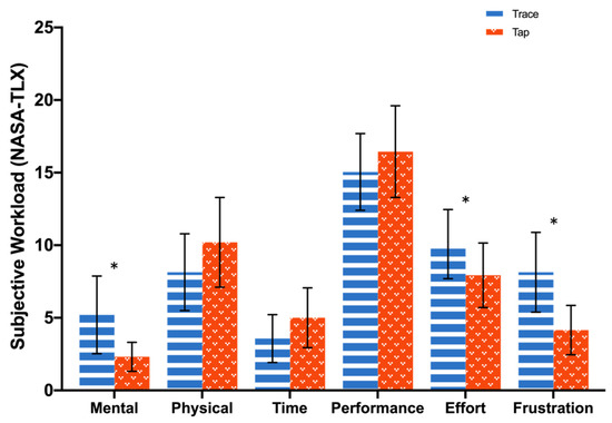 Subjective workload (according to the six facets of the NASA-TLX scale) of participants when using different text entry methods. Error bars represent 95% CI. The symbol * indicates a statistically significant main effect.