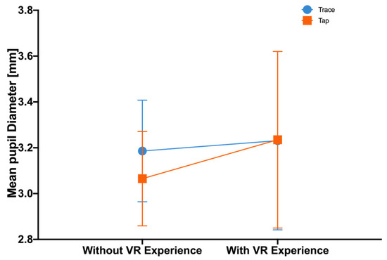 Pupil diameter is considered a significant indicator of cognitive load during typing tasks. The text entry method had a significant effect on pupil diameter, with Trace (M = 3.2, SD = 0.1) presenting higher values than Tap (M = 3.2, SD = 0.1): F(1, 33) = 7.3, p = 0.01, ηp2 = 0.18. No significant main effect between the experienced group and the inexperienced group on pupil diameter was detected: F(1, 33) = 0.3, p = 0.59, ηp2 = 0.01. A significant interaction was found between the input method and the VR experience: F(1, 33) = 8.2, p = 0.007, ηp2 = 0.20. The follow-up analysis revealed that participants without VR experience had a larger mean pupil diameter when using Trace (M = 3.2, SD = 0.1) compared to Tap (M = 3.1, SD = 0.1), p < 0.001. Figure 7 shows the mean pupil diameter.