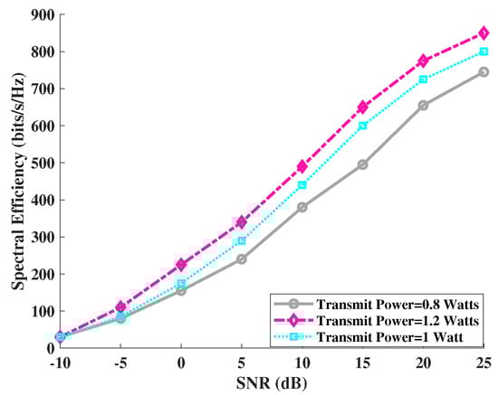 The transmit power of an AP is a major factor that can help evaluate the performance of a massive MIMO system in terms of energy and spectral efficiency. Therefore, we analyzed the impact of transmit power variations on the spectral efficiency of our proposed LP-MMSE scheme. Simulations were performed for the centralized scenario () with the following set of values for transmit power, Watts. It is evident from Figure 2 that the increase in the downlink transmit power results in an increase in spectral efficiency, and the SNR vs. spectral efficiency graph shifts upwards. Similarly, a decrease in transmit power decreases the spectral efficiency and causes the graph of spectral efficiency to shift downwards. The trend shown in the graph is in line with the findings in the literature suggested by authors in [5]. Therefore, based on the result shown in Figure 2, we selected the value of 1 Watt for transmit power in subsequent simulations, since it represents an optimal value for improvement in both spectral and energy efficiency of the system.