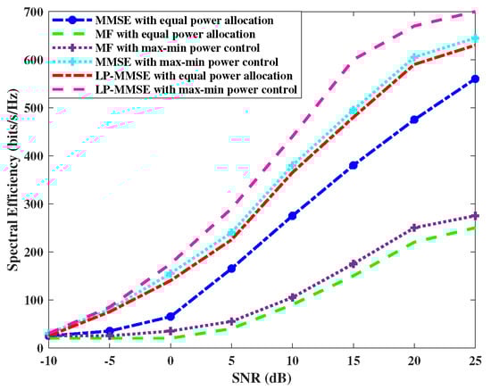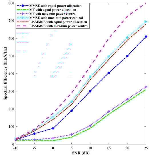 We analyzed the spectral efficiency performance of the max–min power control algorithm in both the uplink and downlink. Figure 3 shows the performance of MMSE, LP-MMSE, and MF schemes on the basis of spectral efficiency in the downlink by utilizing max–min power control versus equal power allocation. We considered the centralized scenario () and for our simulations. The results of the downlink case are shown in Figure 3, which depict that the spectral efficiency of LP-MMSE with max–min power control at 24 dBs is 800 bits/s/Hz, whereas, with equal power allocation, it is at 650 bits/s/Hz. Figure 4 compares the performance of the spectral efficiency in the uplink for the proposed scalable LP-MMSE, MMSE, and scalable MF schemes by utilizing max–min power control versus equal power allocation. Figure 4 shows that the spectral efficiency of LP-MMSE with max–min power control at 24 dBs is 690 bits/s/Hz, whereas, with equal power allocation, it is at 625 bits/s/Hz. Therefore, LP-MMSE with max–min power allocation reports a increase in spectral efficiency over equal power allocation. It is apparent from these results that the max–min power control algorithm provides better spectral efficiency compared with equal power allocation in both the uplink and downlink. Moreover, the LP-MMSE with max–min power control provides significant performance improvement in terms of spectral efficiency over angle-based MF and MMSE schemes with max–min power control.